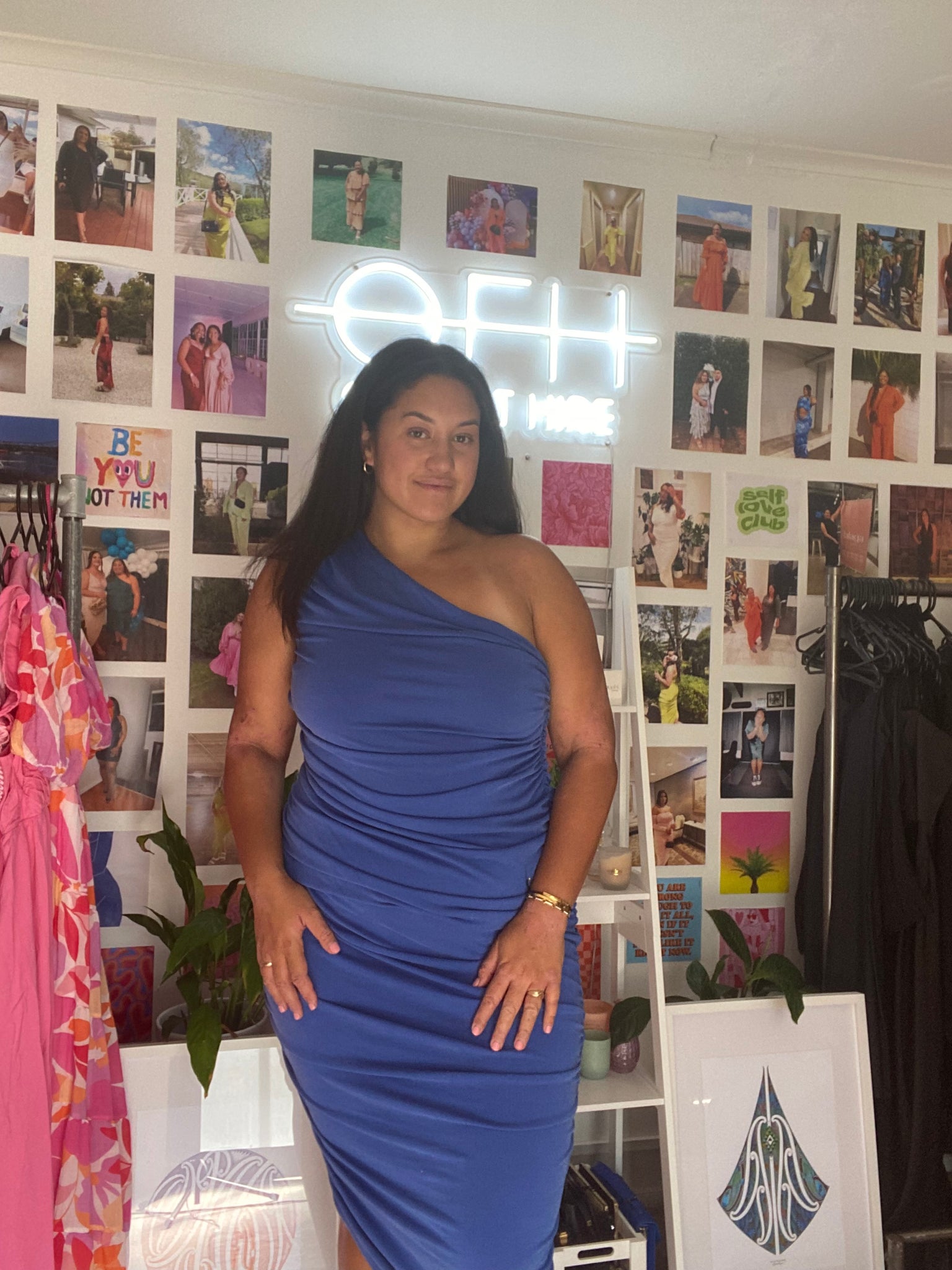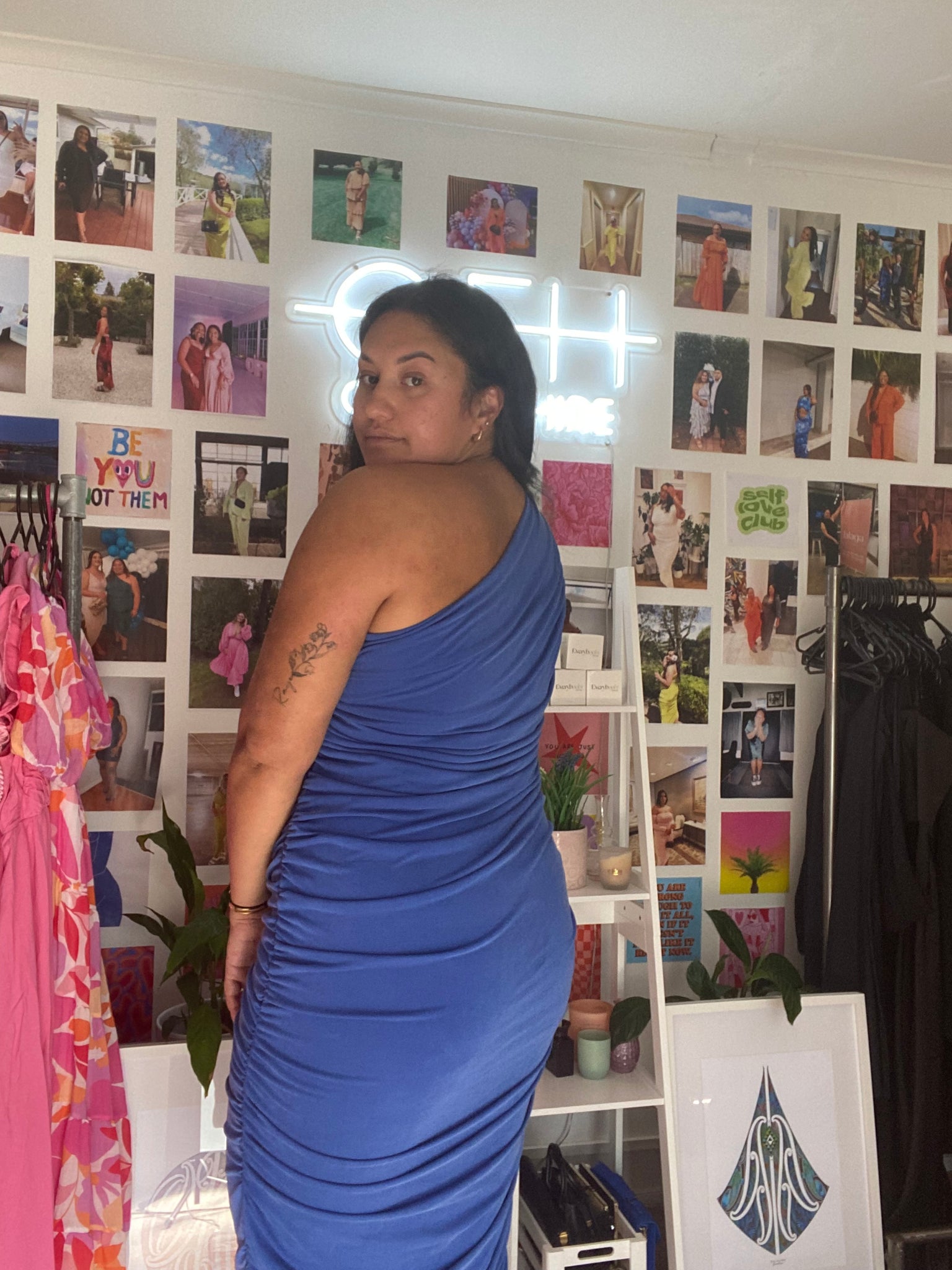 Blue bodycon midi dress with ruching on both sides.